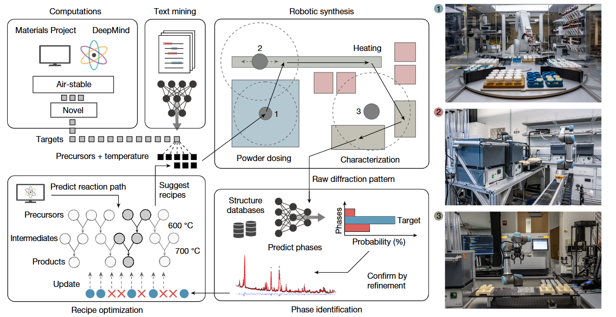 文章提出并构建了一个名为 A-Lab 的闭环自主实验平台。该系统不是一个简单的自动化设备,而是一个集成了计算、机器学习、数据库和机器人技术的智能决策系统,具备“自主思考、自主设计、自主执行、自主分析、自主优化”的能力。
